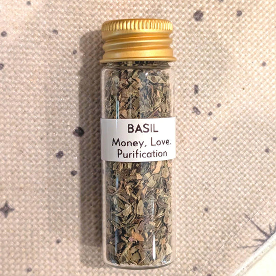 Basil - Money, Love, Cleansing, & Purification Recommended to use for spell jars, spirit offerings, incense, candle dressing, etc. Perfect for a beginner witch's apothecary collection! Hand packed and labeled in a 15mL screw top glass...Regular price $3.50 -
