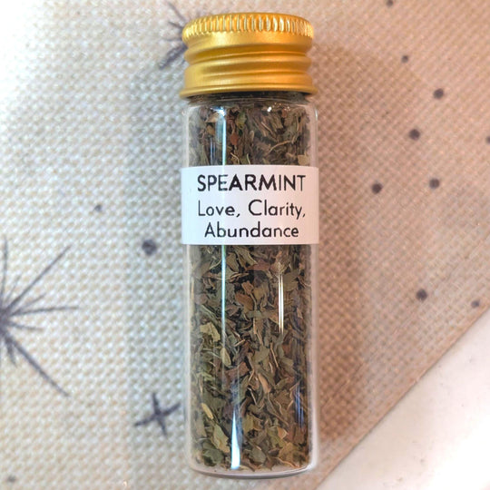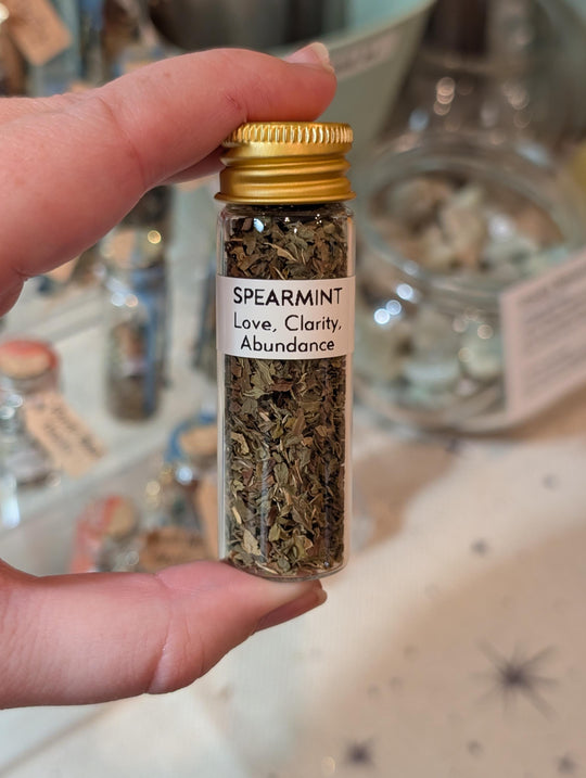 Spearmint - Love, Clarity, Healing, & Abundance Recommended to use for spell jars, spirit offerings, incense, candle dressing, etc. Perfect for a beginner witch's apothecary collection! Hand packed and labeled in a 15mL screw top glass...Regular price $3.50 -