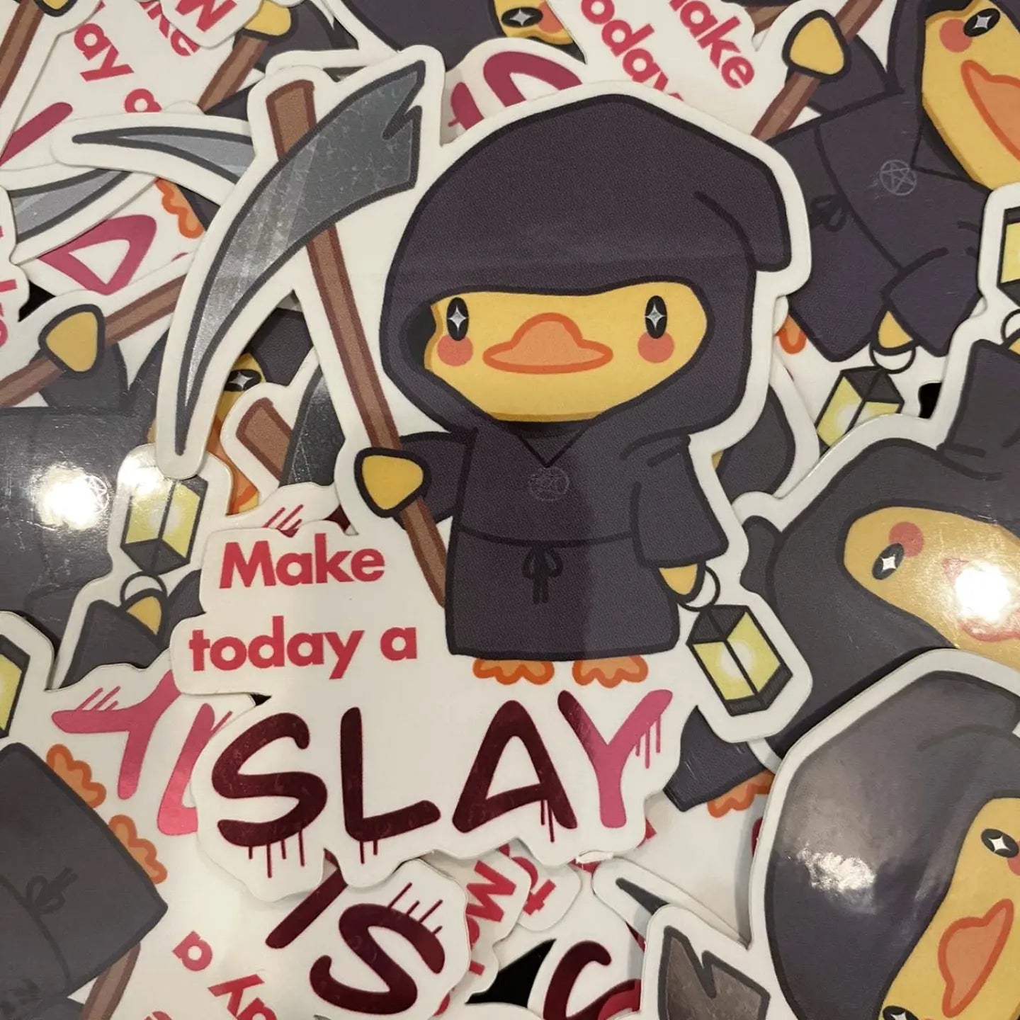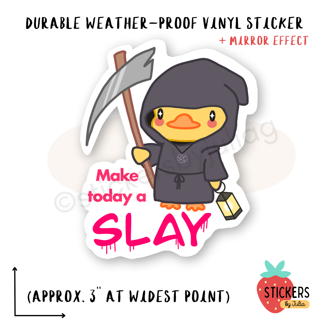 "Make Today A Slay" glossy waterproof vinyl sticker with mirror effects on the blade, eyes, necklace, and the word slay - designed by StickersByJuliaG! 🍓✨